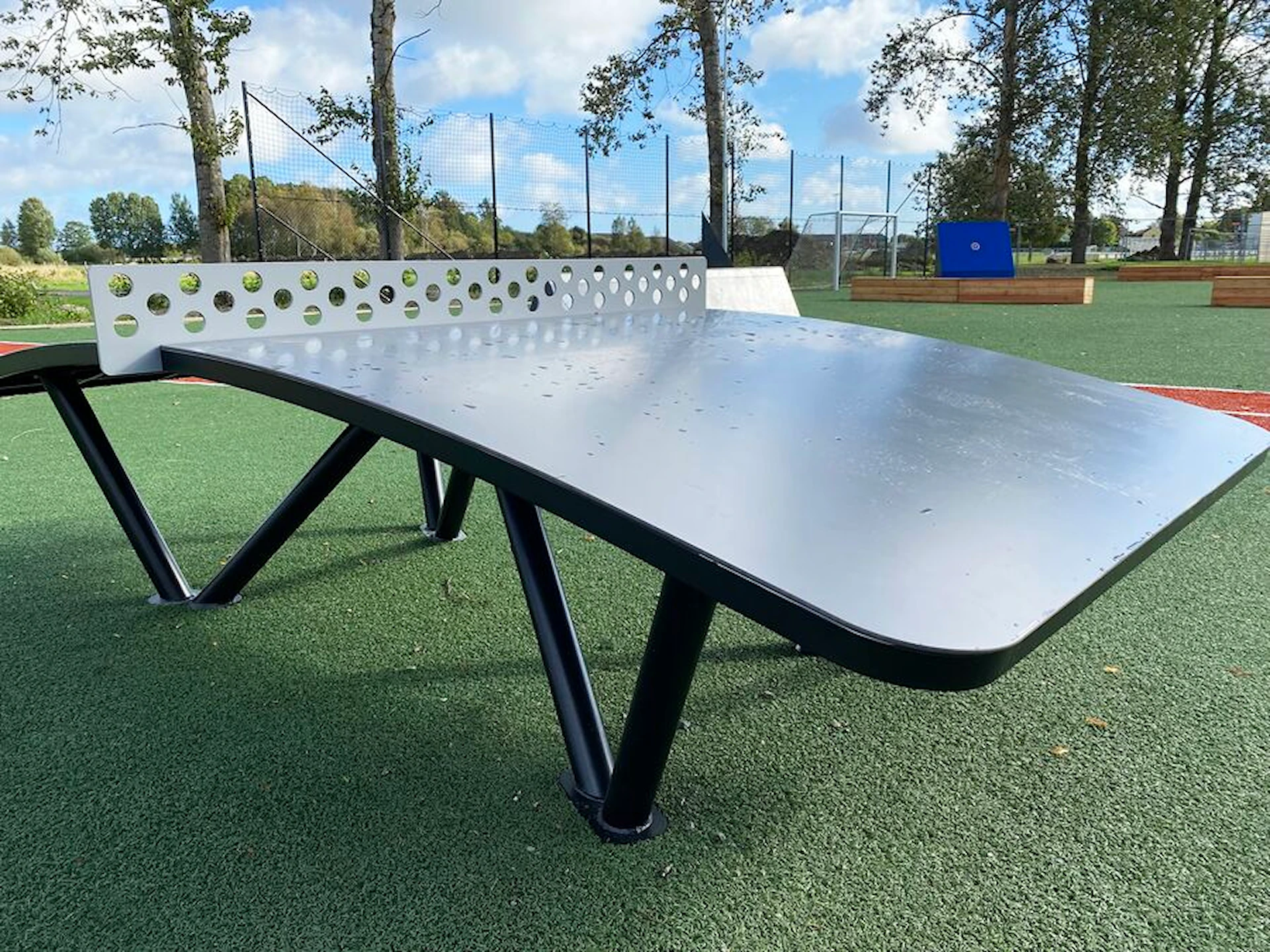 Ett mycket robust bord av varmförzinkat och pulverlackerat stål. Tre olika standard RAL-färger; 9006, 9005 eller 2002. Bordet kan även levereras i annan RAL-färg på begäran. (Här bör du räkna med längre leveranstid, samt ett tilläggspris för specialfärg). Bordet är förberett för infästning på underlaget, det är UV- och väderbeständigt och mycket resistent mot vandalism. Archball-bordet levereras inklusive stålnät.