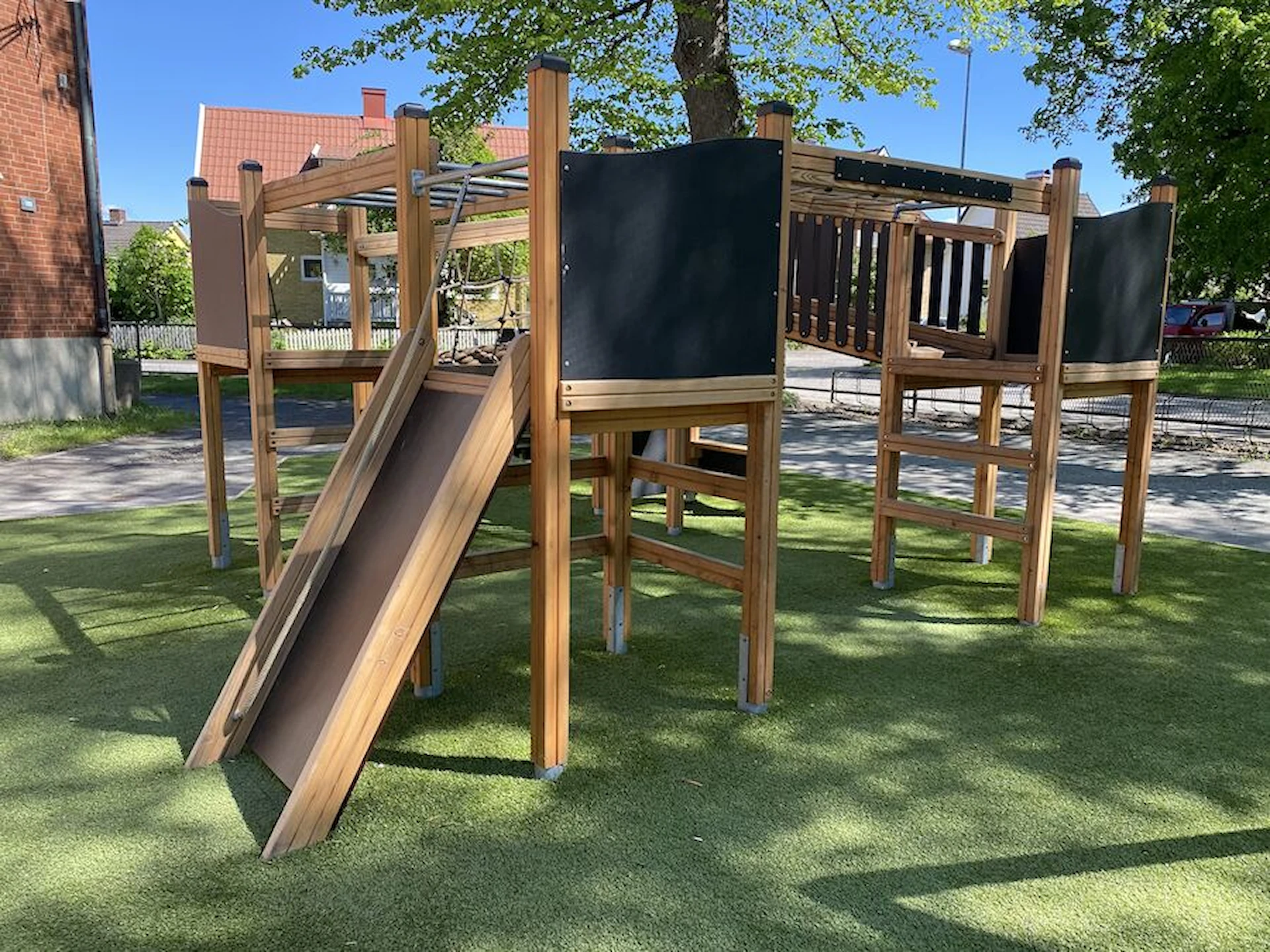 Däremot har vi många produkter utan trä som kan levereras i stort sett omgående, exempelvis Boulder Rocks, gungor, mål, basket, bordtennis, fristående rutschar, klätternät, studsmattor, bänkbord med mera.