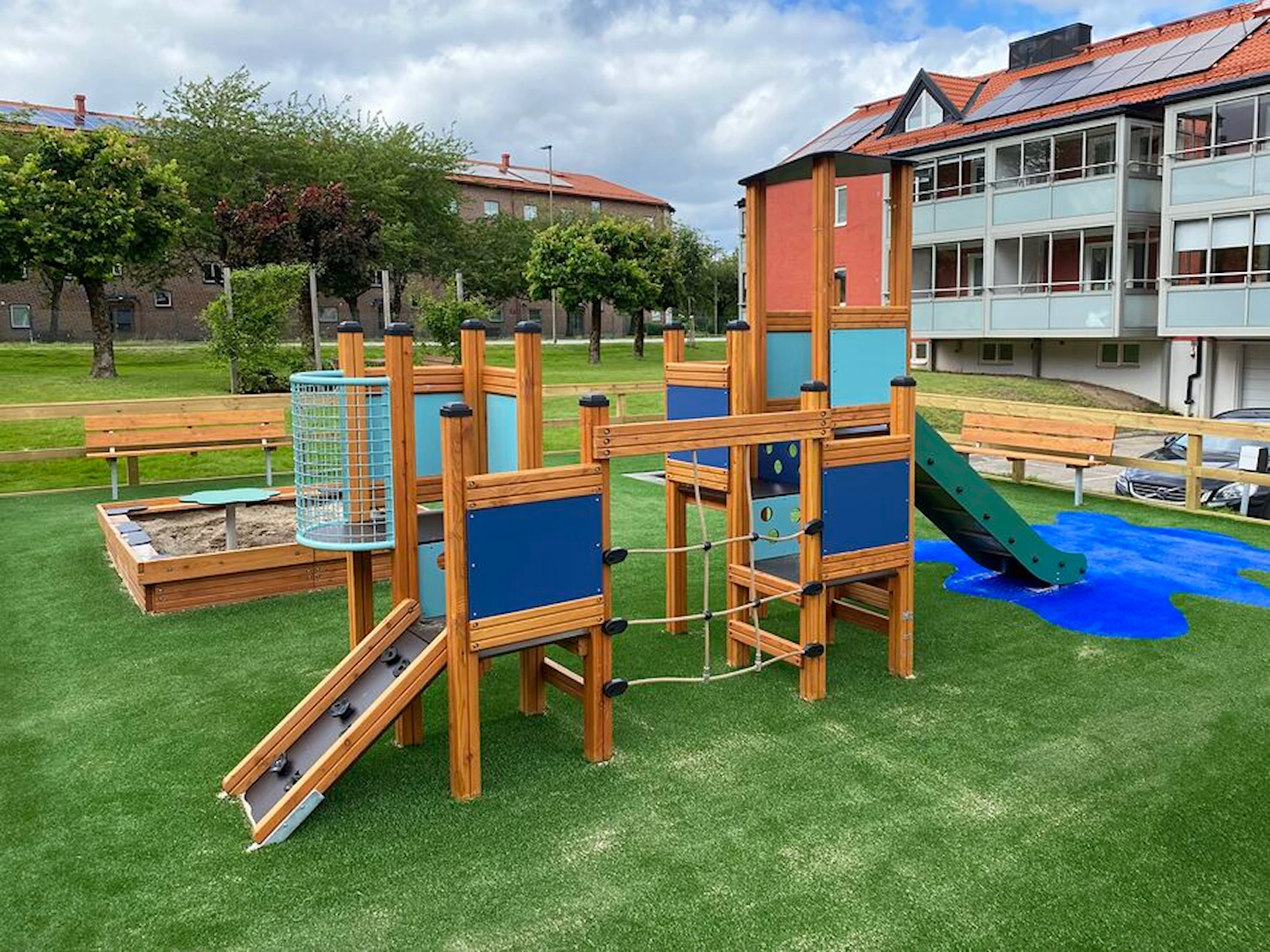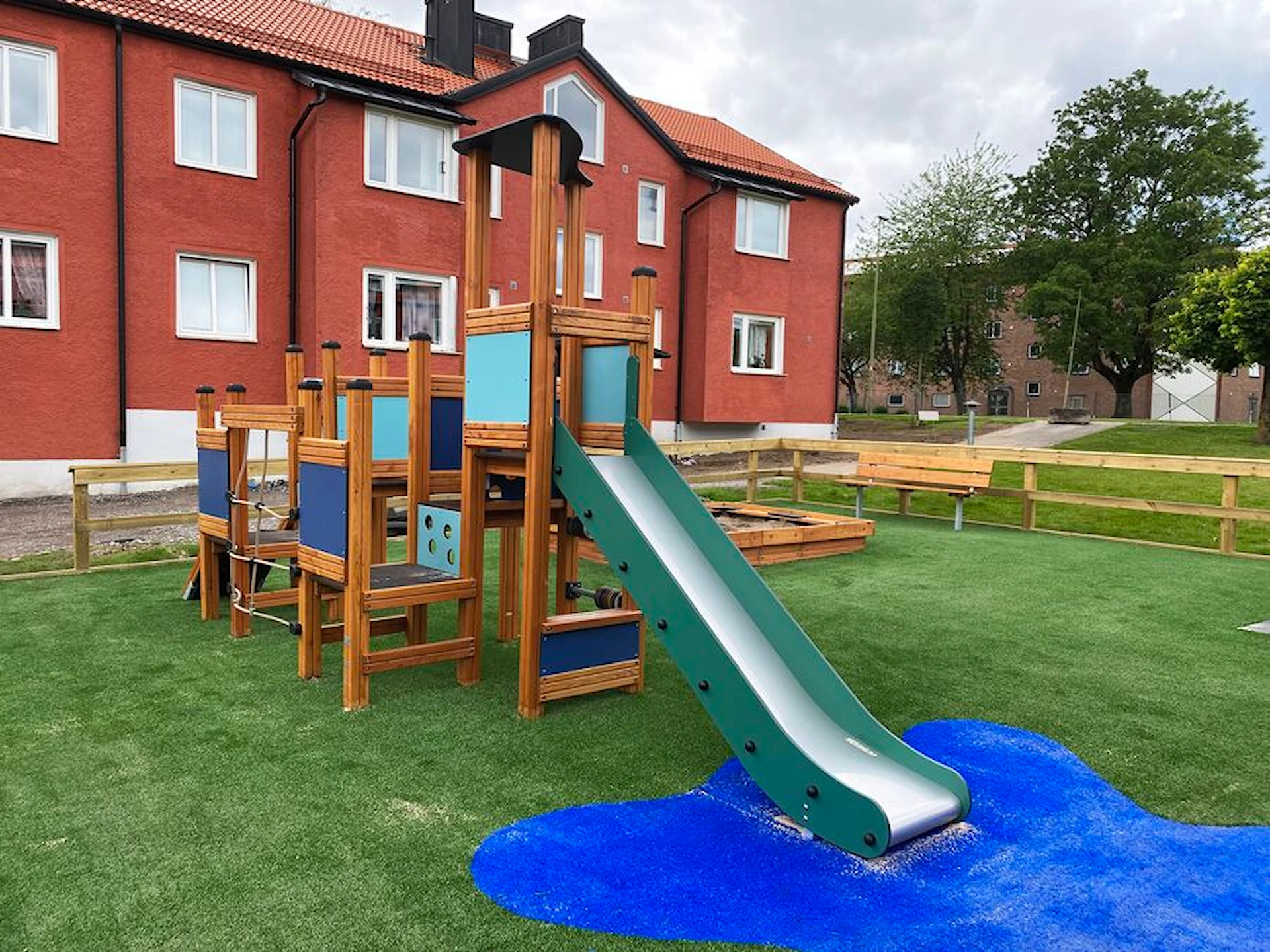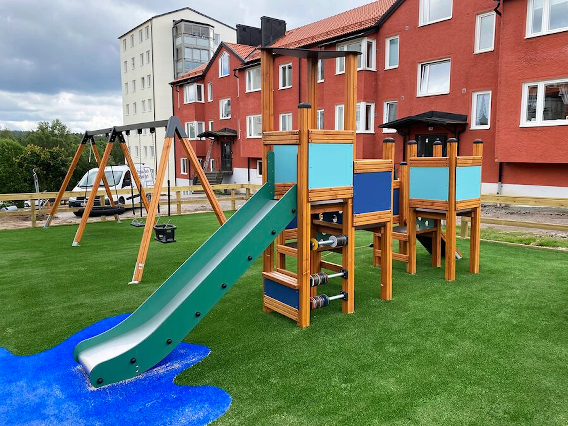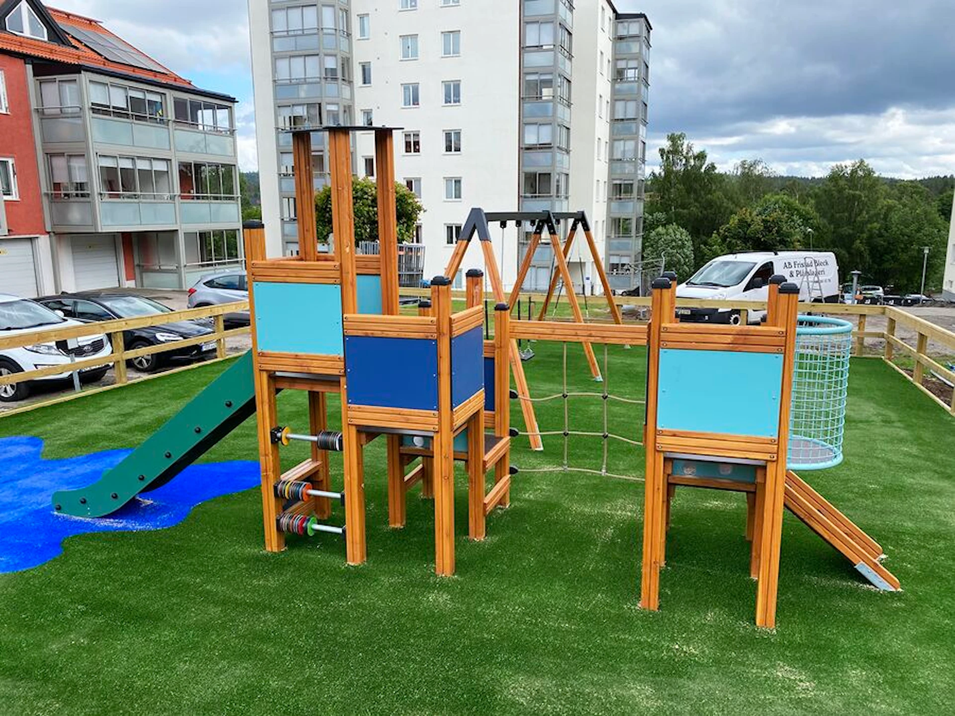 Däremot har vi många produkter utan trä som kan levereras i stort sett omgående, exempelvis Boulder Rocks, gungor, mål, basket, bordtennis, fristående rutschar, klätternät, studsmattor, bänkbord med mera.