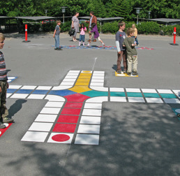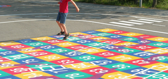 Vi erbjuder både motiv och montering av asfaltsmålningar till skolgårdar, innergårdar och andra ytor som behöver livas upp och få ett mer kreativt uttryck. Välj bland flera olika klassiska spel och aktiviteter som hoppa hage, fia med knuff, schack, sifferlekar och populära King out-rutor. Flytta ut hela klassen till skolgården och använd asfaltsmålade siffror och bokstäver i undervisningen. Ett garanterat populärt sätt att lära sig räkna och stava.