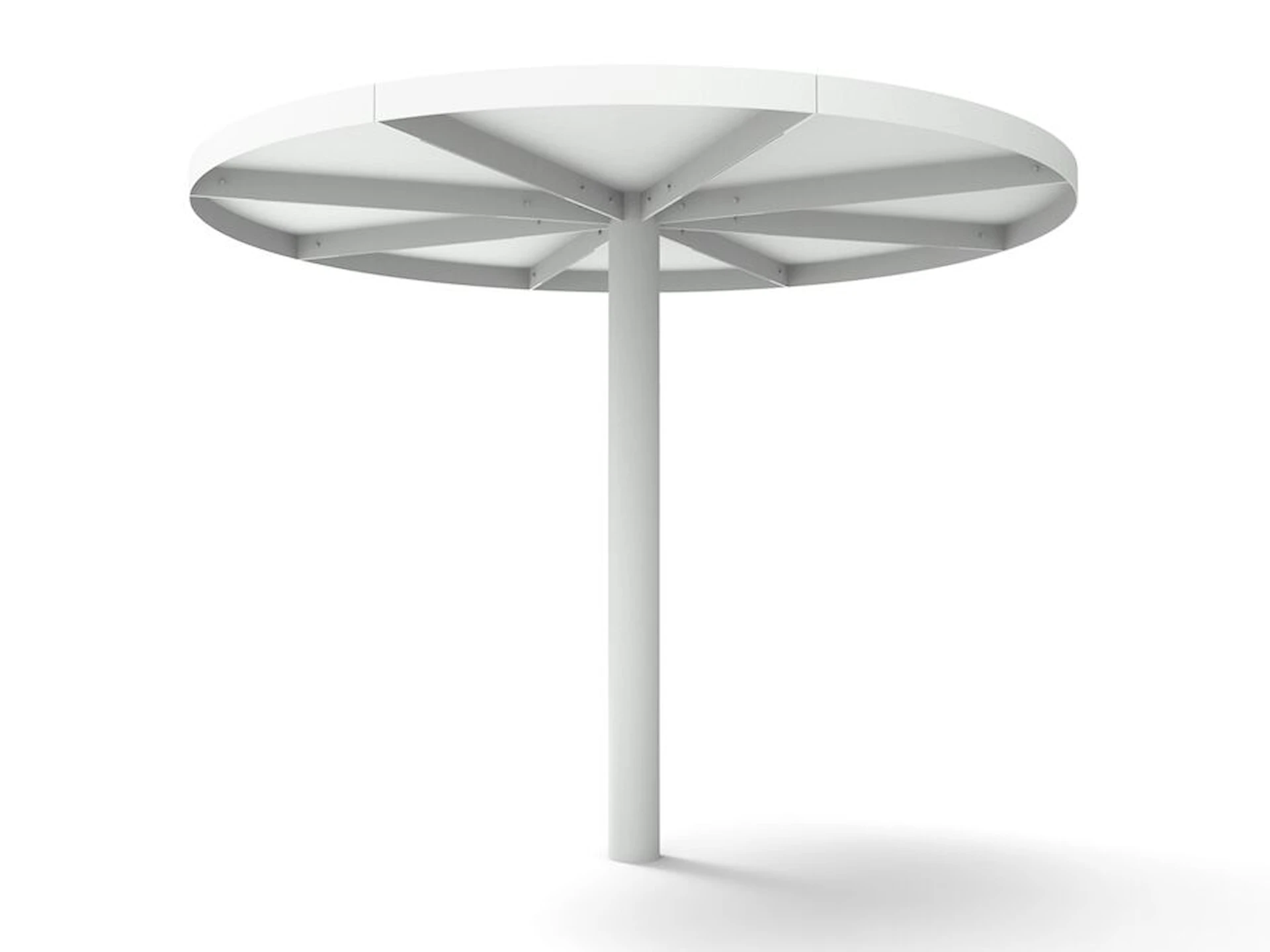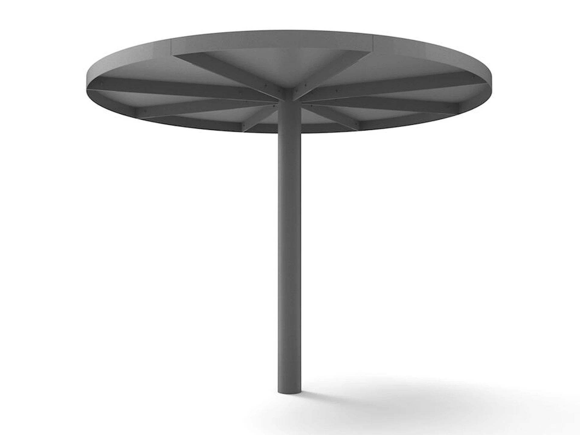 Meum Skärmtak är runt och erbjuds även i en Light-version med perforerad yta som släpper igenom lite mer ljus. Meum gjuts ner i marken och står stadigt år efter år. Genom att lägga till anti-graffiti-lack kan du placera ditt parasoll även i offentliga utemiljöer med högre slitage.