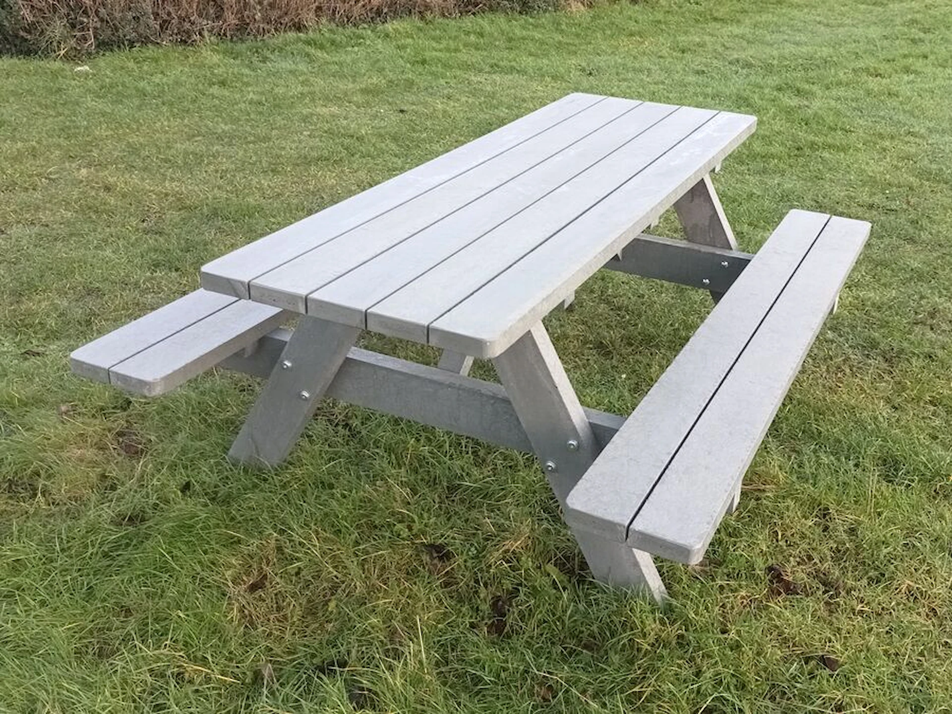 Plankorna har rundade hörn och är vattenavvisande, extremt robusta och helt splitterfria. Bänkbordet finns i färgerna grått, brunt och svart, där grått är standard. Välj den färg som passar bäst in i din omgivning. Bänkbordet är fristående men går även att förankra i marken.