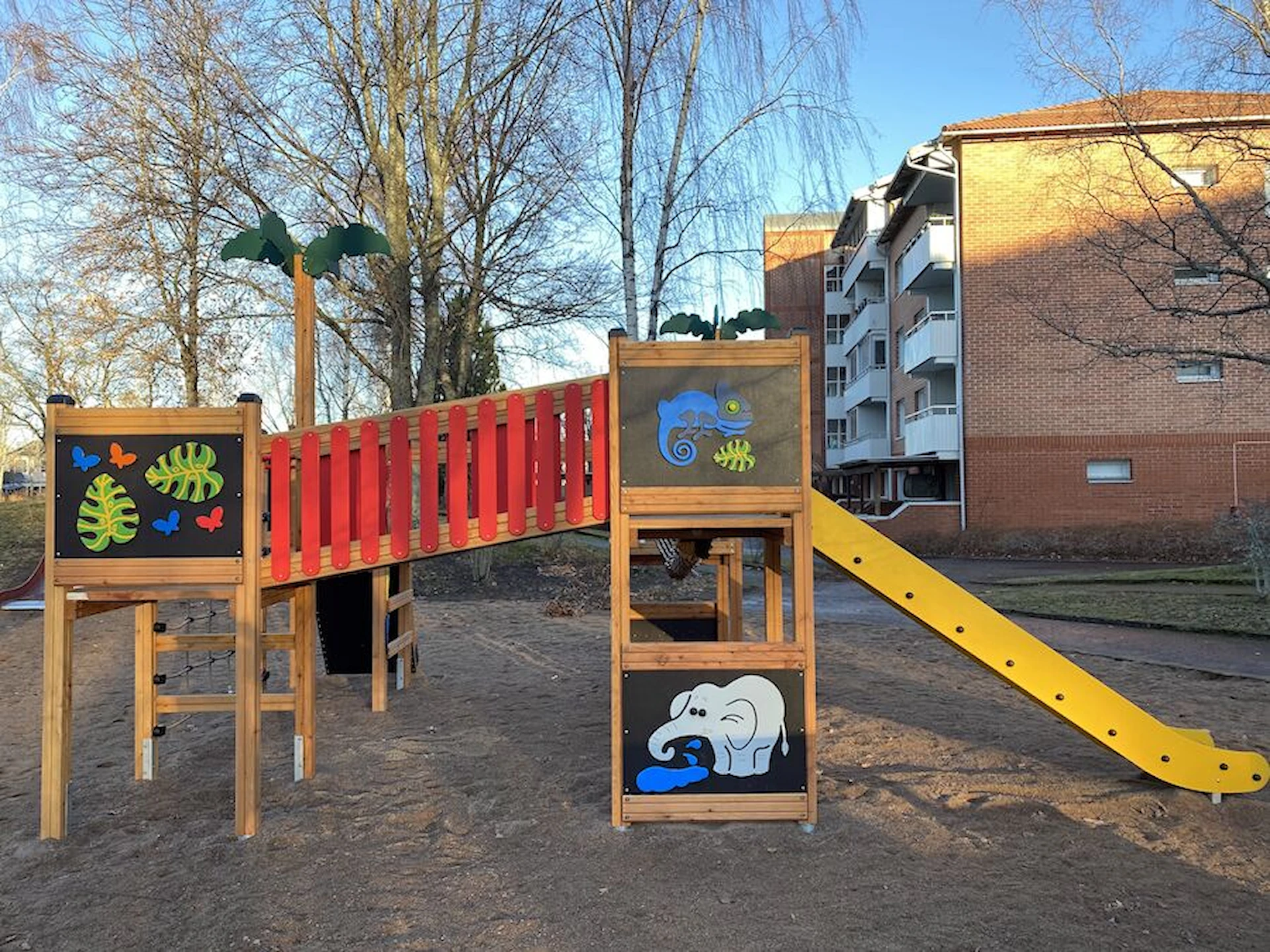 Däremot har vi många produkter utan trä som kan levereras i stort sett omgående, exempelvis Boulder Rocks, gungor, mål, basket, bordtennis, fristående rutschar, klätternät, studsmattor, bänkbord med mera.