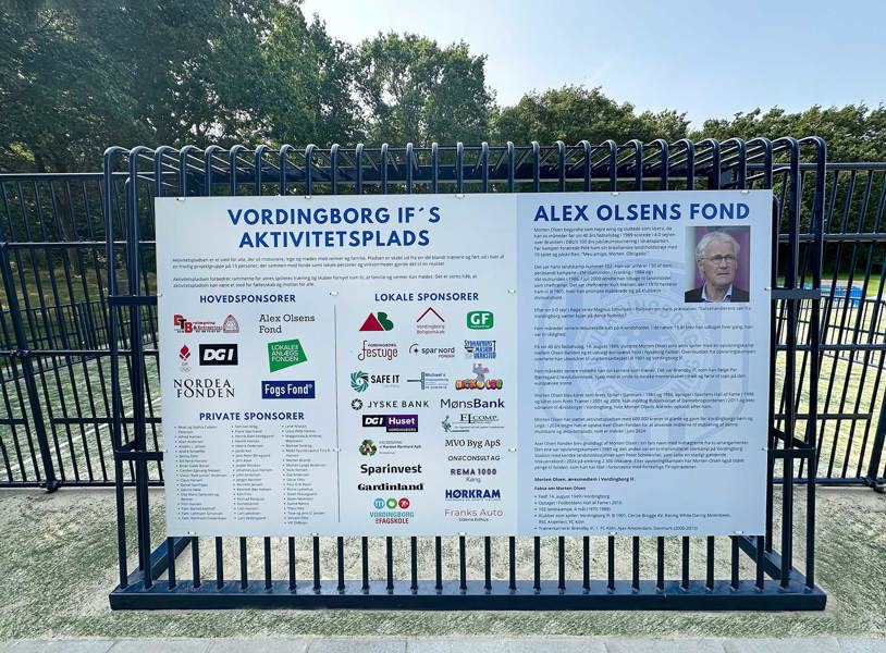 Det största bidraget till aktivitetsytan kom från Alex Olsen-fonden, som grundades av stadens egen son och landslagslegendaren Morten Olsen i hans fars namn år 1989. Morten Olsen deltog vid invigningen av aktivitetsytan – och delade med sig av fina minnen från början av sin karriär, som just tog sin början på samma planer där nya generationer i Vordingborg IF springer runt i dag.