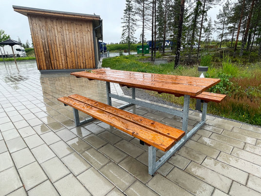 Rastplatsen erbjuder välskötta toaletter, som tillsammans med bänkborden och stora ytor gör det enkelt att stanna till för fika eller vila – oavsett hur lång din resa är.