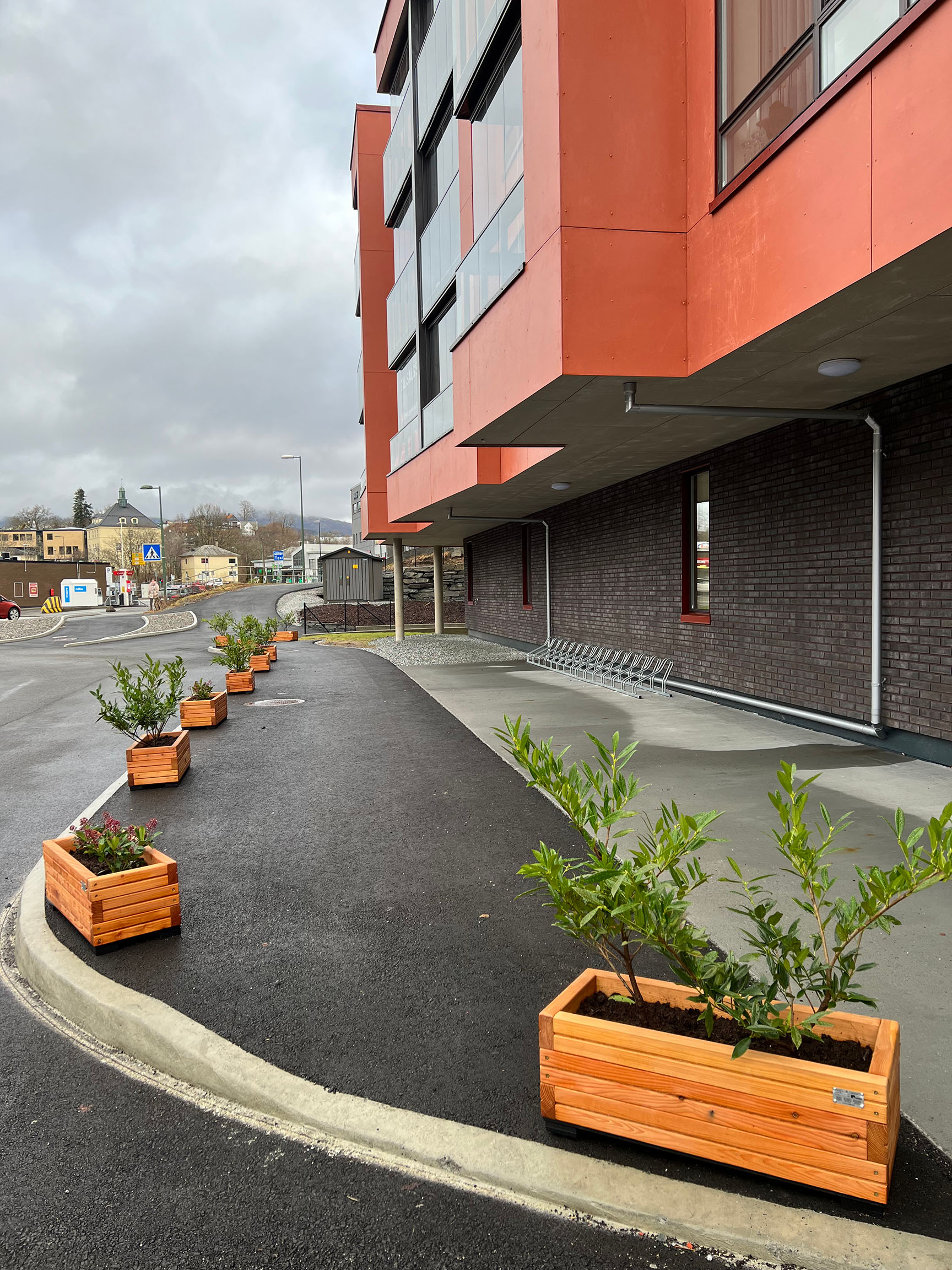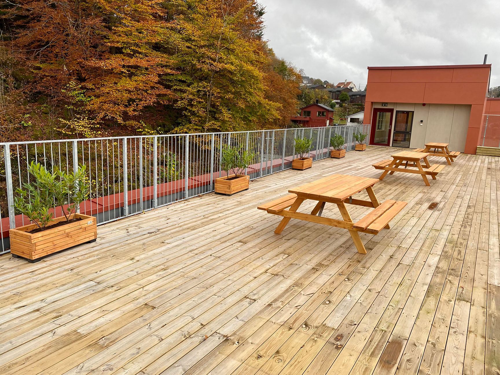 Här finns fågelbogunga, sandlåda och klätternät till stor glädje för bostadsrättsföreningens yngre invånare. Bänkbord och blomlådor i lärk bibehåller den röda tråden och ger en ombonad ram runt området. Bänkborden på takterrassen gör det enkelt för både unga och äldre att umgås.