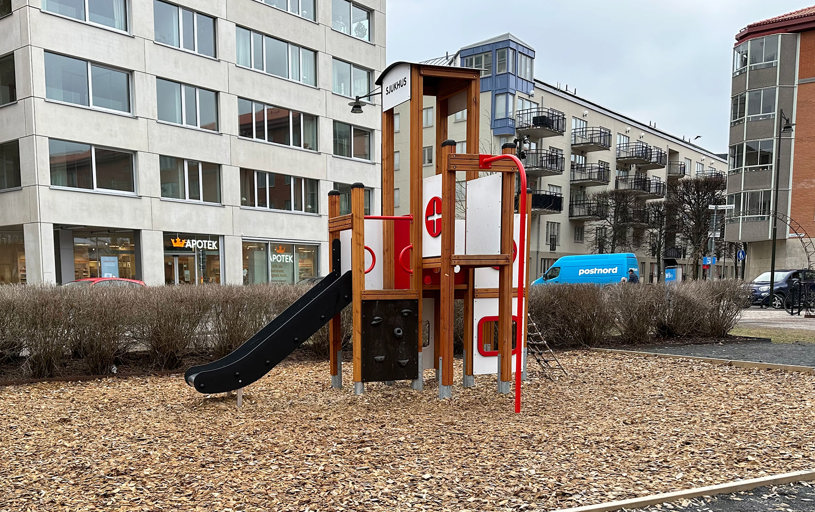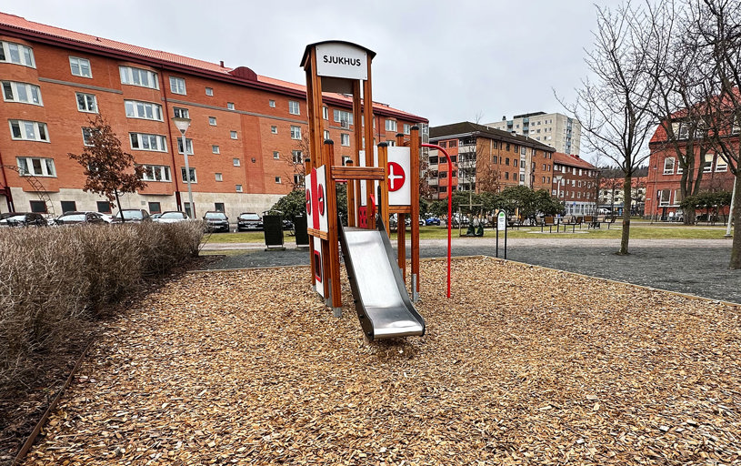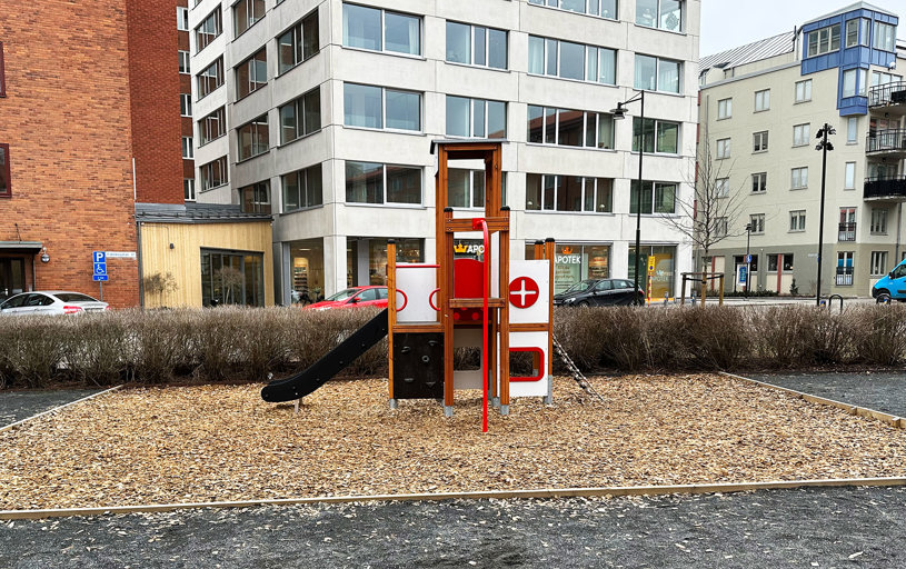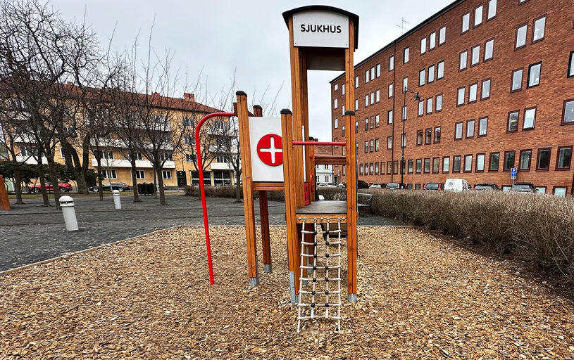 I samband med önskemålen om en lekställning på temat sjukhus gjordes en modifiering av vår lekställning Sjukhuset. Vi hjälper alltid till att tillmötesgå kundens önskemål så långt det går. Här blev resultatet ett fint samarbete mellan oss och landskapsarkitekten som hade en vision.