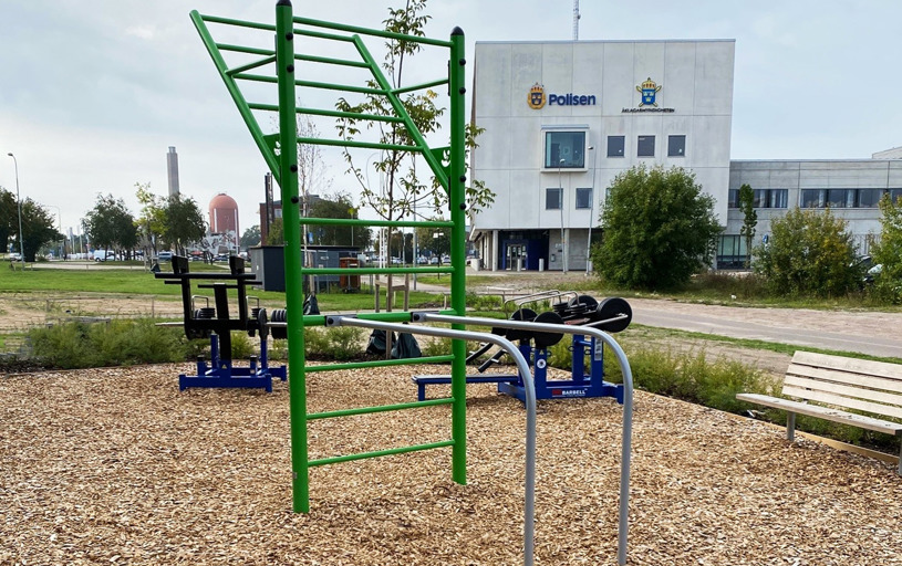 Det lilla utegymmet består av två träningsmaskiner med justerbara vikter samt en träningsställning för funktionella övningar. Utegymmets närmsta granne är polishuset som får närheten till träna i anslutning till arbetspasset.