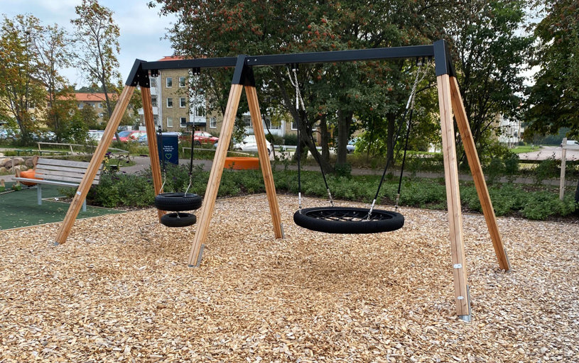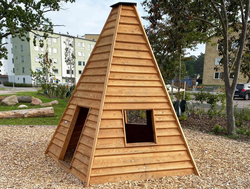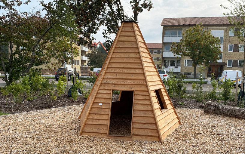 Lekplatsen erbjuder en gungställning med kompisgunga, fjädergungor och ett lekhus i form av ett naturtroget tipitält.