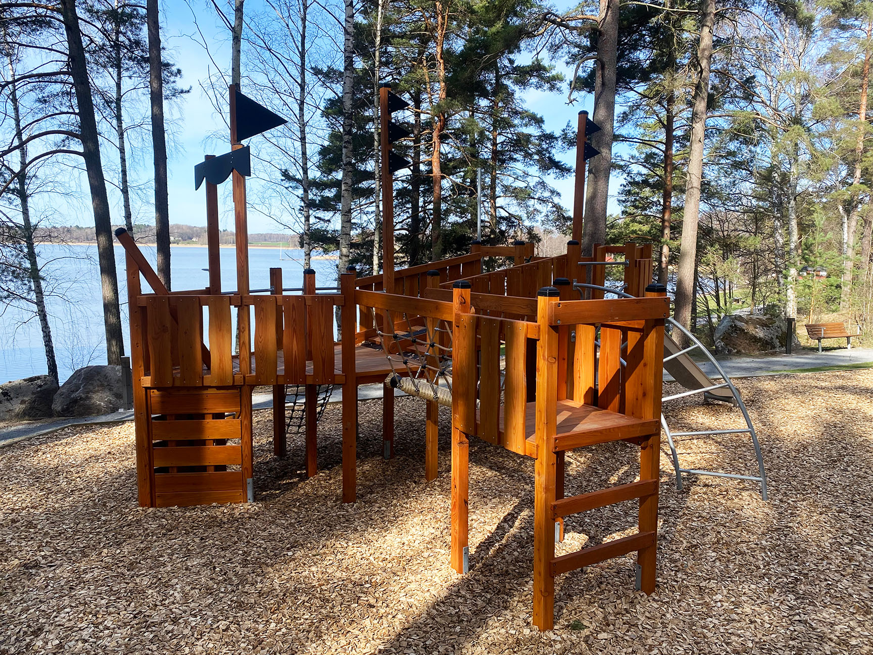 Klätterskeppet ligger riktigt fint precis vid vattnet och erbjuder mängder av möjligheter till klättring, rutsch, balans och fantasifulla rollekar.