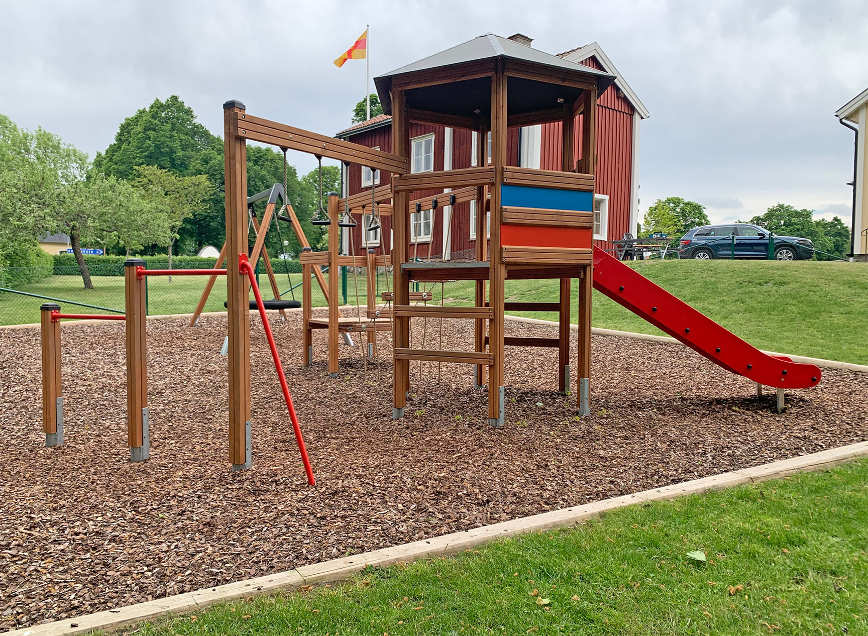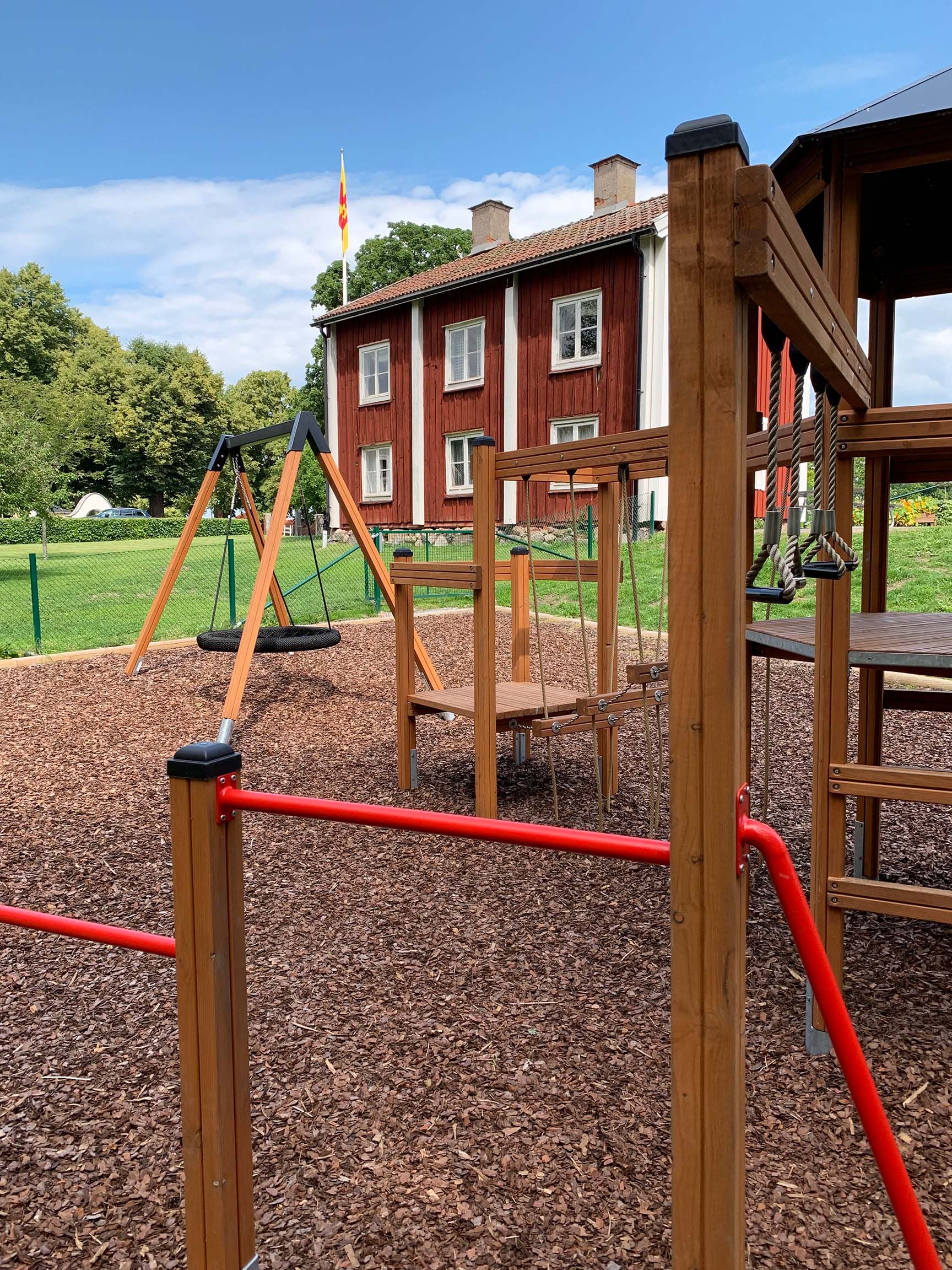 Barnen uttryckte även önskemål om en kompisgunga, en rutschkana och någon mer typ av utmaning. Här passade Klätterkanten perfekt in med både rutschkana och spännande moment som volträcke, armgång och en balansstege som hänger i rep. Att allt sitter ihop gjorde att man sparade yta och även fick plats för gungställningen med fågelbogungan.