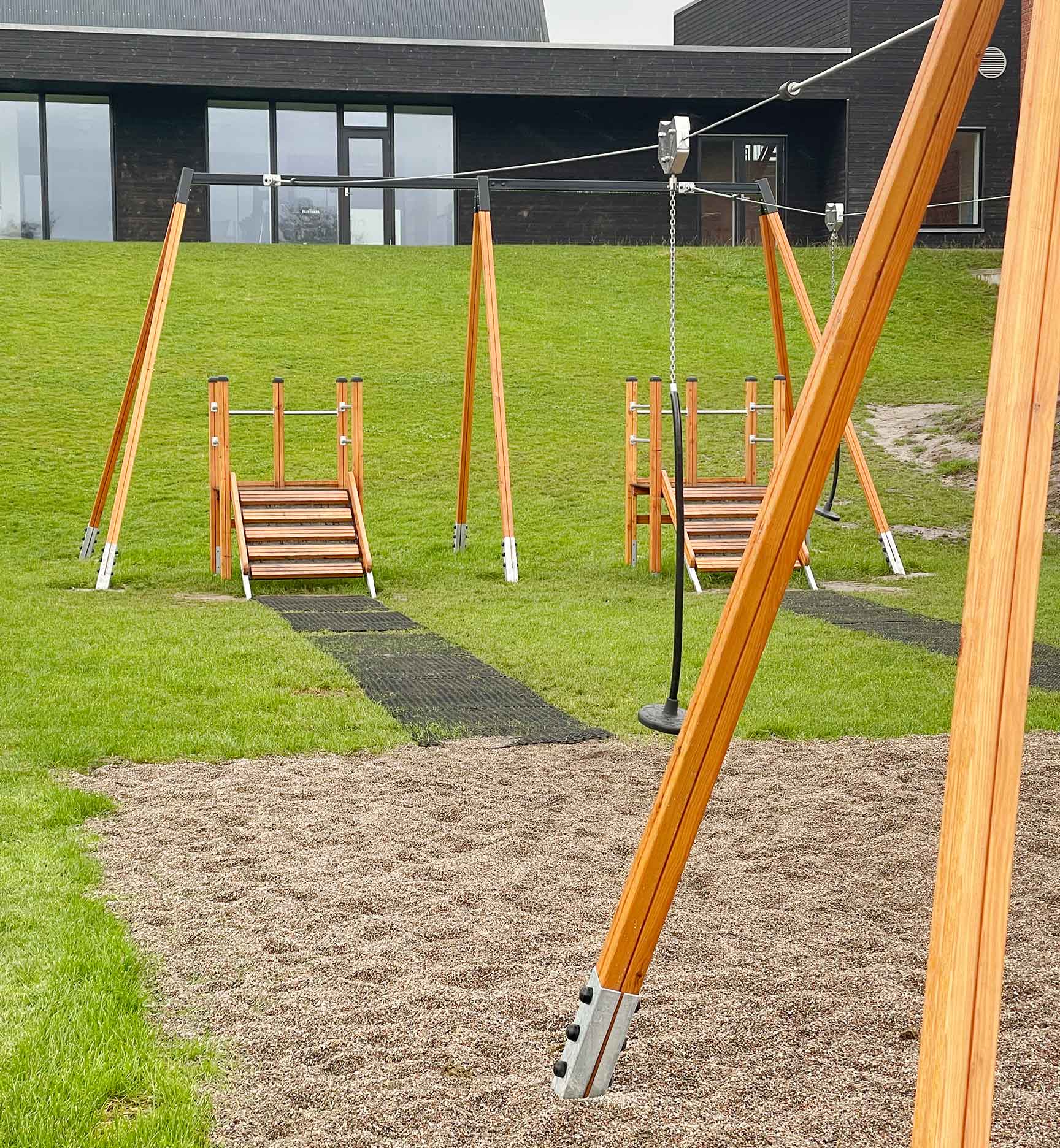 Skolan ville rusta upp skolgården med något nytt att göra på rasterna. Linbanan med dubbla plattformar passade perfekt in i ett befintligt grönområde och gör det möjligt att sväva mot varandra.