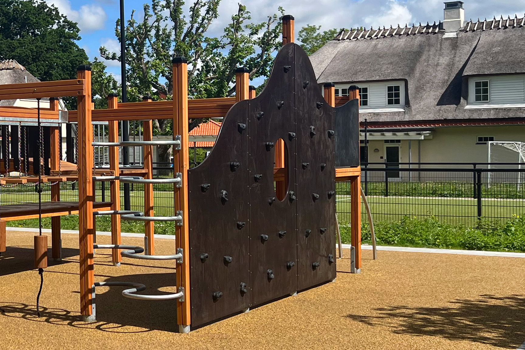 Lekställningen erbjuder bland annat rutschkana, klätterramp, repstegar, armgång, hängbro, utkiksposter, klätternät, tunnel, brandmansstång och en stor utmanande klättervägg. Där är alltså massor av möjligheter till aktivitet och lek – till exempel tafatt-lekar, eftersom barnen kan ta sig runt på flera olika sätt.