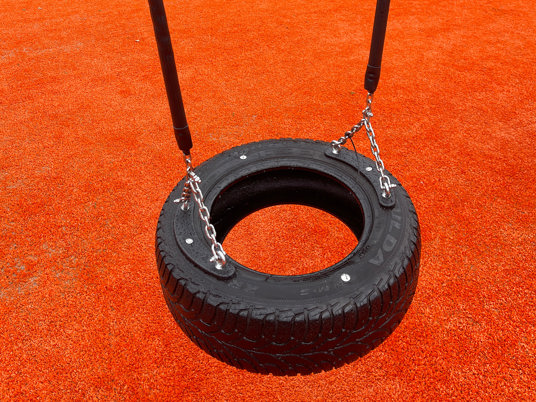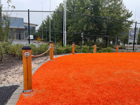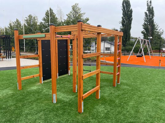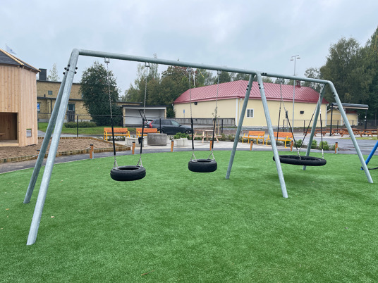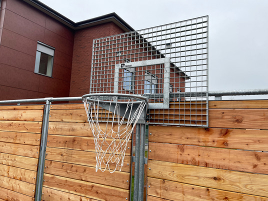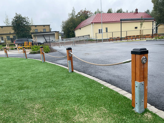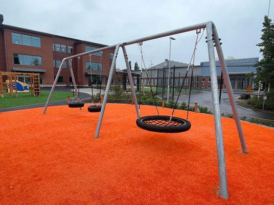 En fantastisk varierande skolgård med olika rum för olika aktiviteter. Underlagen skiftar mellan färgrikt konstgräs, riktigt gräs, asfalt och fin stenläggning.