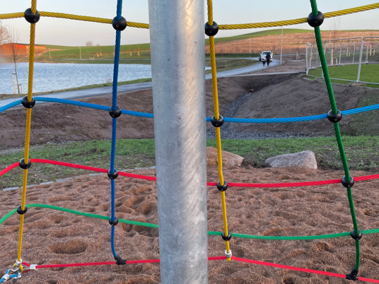 Lekplatsen innehåller en 3 meter hög flerfärgad klätterpyramid, kompisgunga och en bred rutschkana. Här passar det utmärkt för barn i alla åldrar att leka medan föräldrarna tar ett pass på utegymmet.