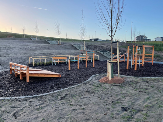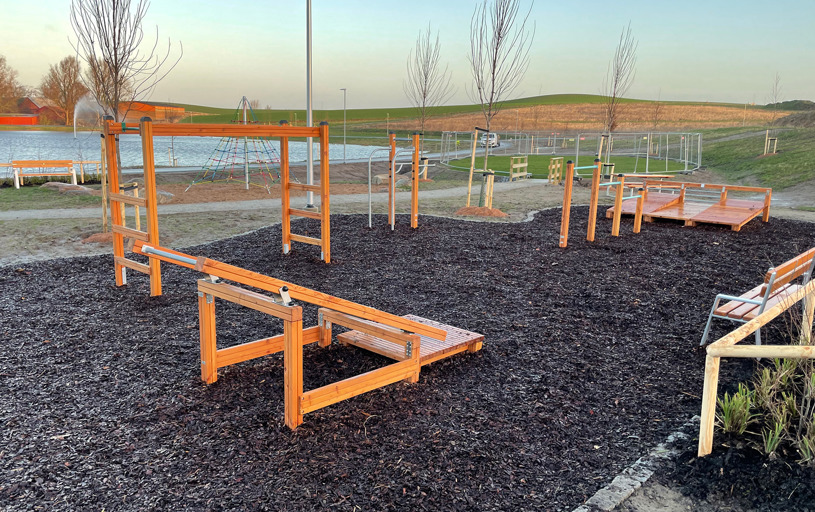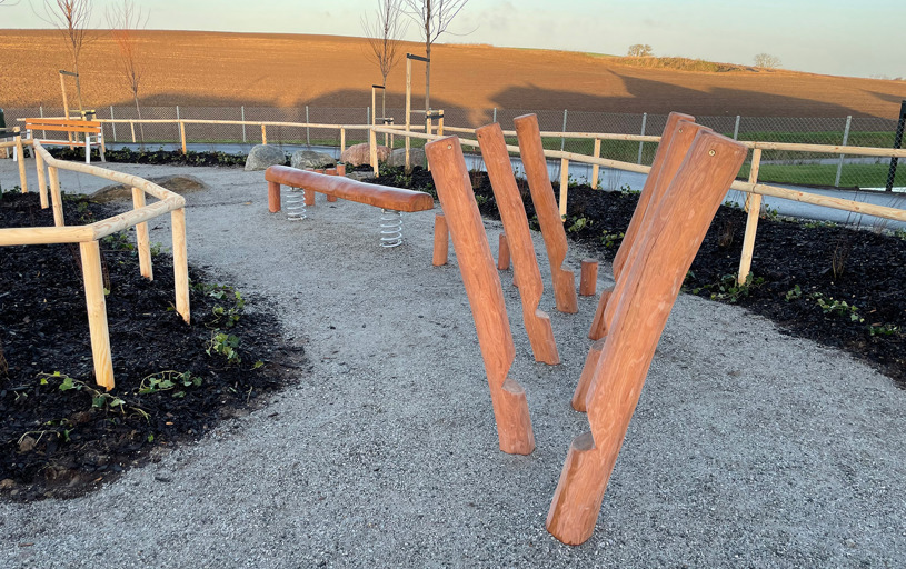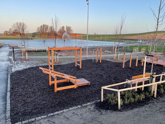 Både de vuxna och barnen har fått möjlighet att träna på utegym. Barnens version är en balansbana med stolphopp, balansgång samt styltor av trä. De vuxna kan träna på utegymmets träningsstationer av vackert lärkträ.