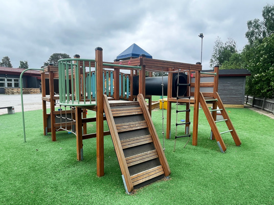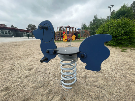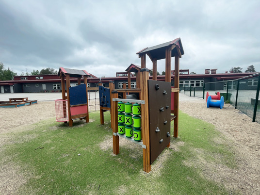 Skolgården har delats in i olika områden efter ålder, med anpassad lekplatsutrustning för de allra yngsta och upp till tredjeklassarna.