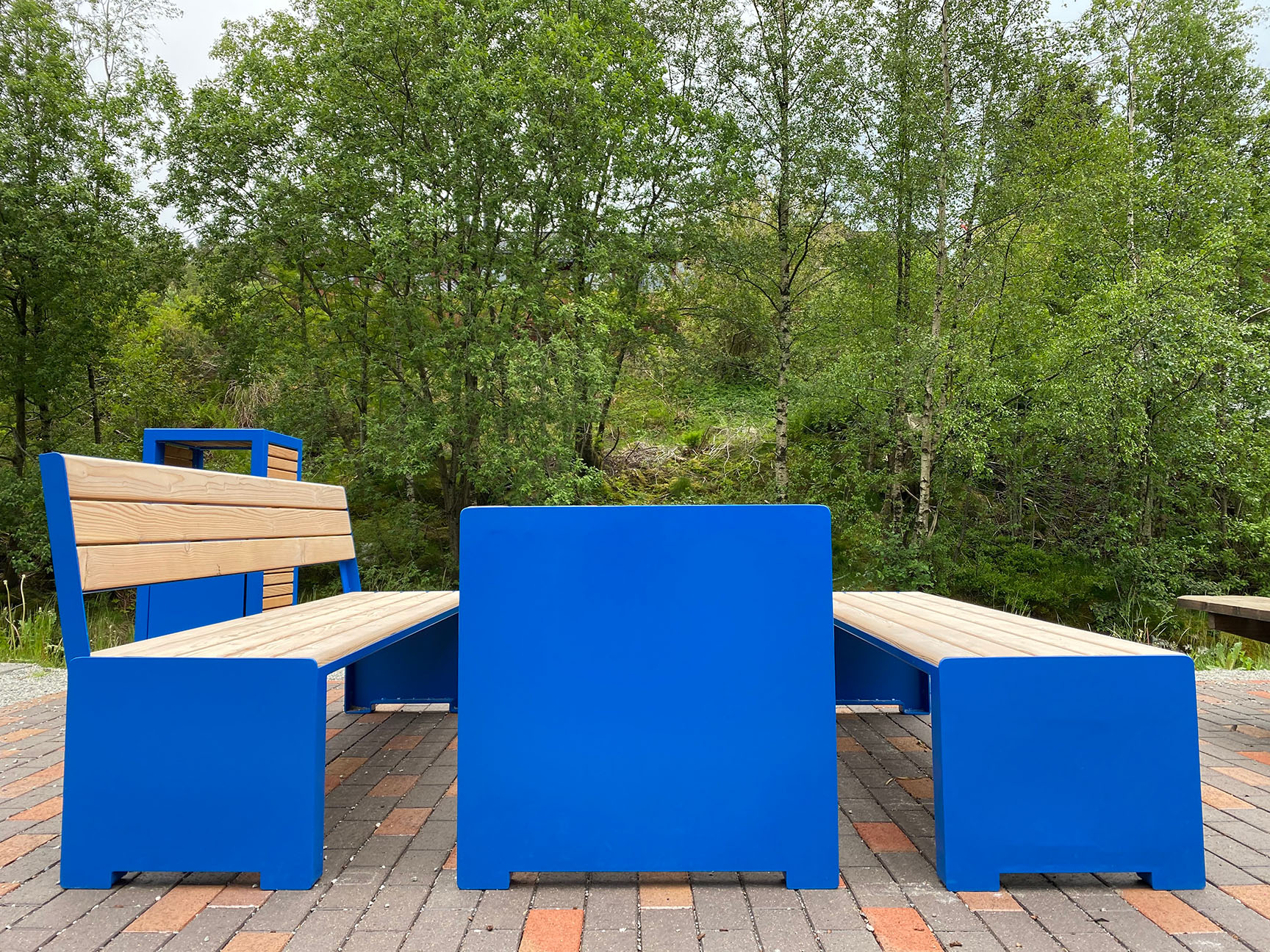 Efter renovering av fasader och balkonger stod turen till utemiljön med både nya sittgrupper och en helt ny lekplats för de lite yngre. Flera olika gemensamhetsområden skapades där parkmöbler i klara färger utgör ett blickfång och bryter av fint mot den grå fasaden. CENTAURUS Soffor, Bord och Bänkar med sina kraftiga helsvetsade sidor tillsammans med TAURUS Papperskorgar bildar färgstarka öar som lockar till social gemenskap. Den blå färgen är RAL 5017 och den röda är RAL 3018.