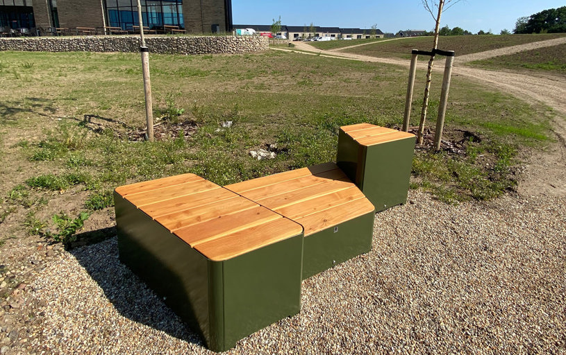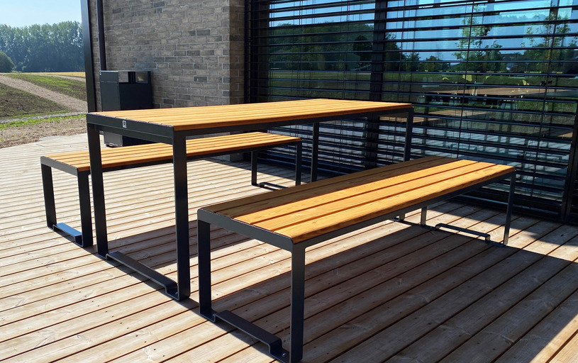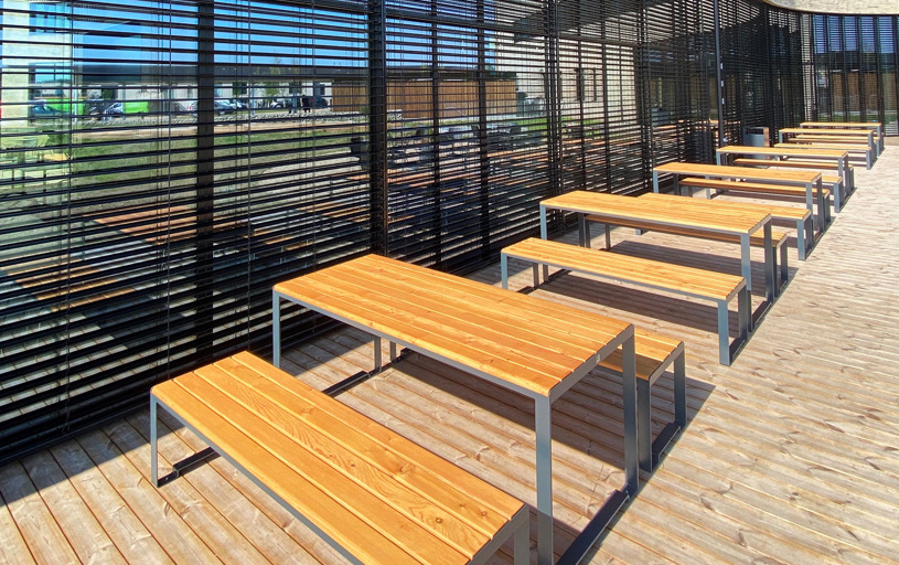 Till DLG’s nya uteplatser föll valet på produktfamiljen TUCANA, som med öppna sidor på bänkar och bord framstår som lätta och luftiga vid sidan om den stora byggnaden. De kompakta modulerna i familjen AQUILA valdes ut för att skapa små mötesplatser vid de omkringliggande stigarna.
