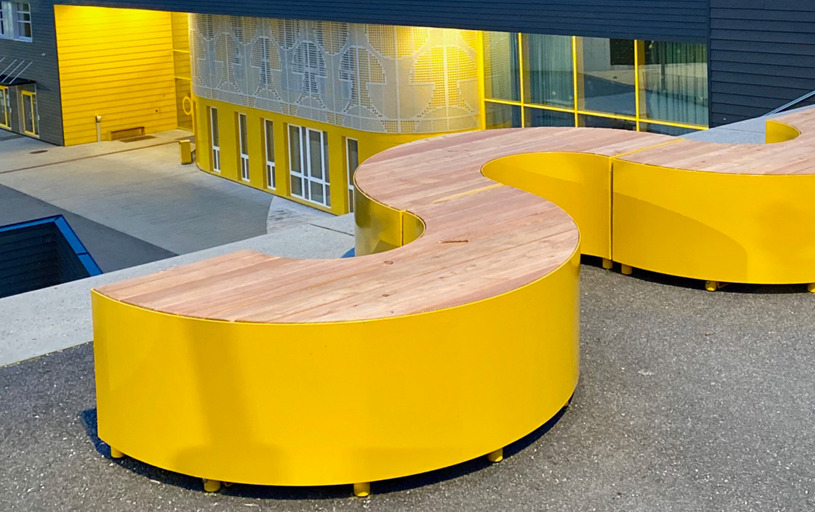 Utanför Nattlands skola och förskola står moderna sittgrupper och bänkar från våra Mobilis Design-serier AQUILA och DELPHINUS. Skolans RAL-färg, som du hittar på flera ställen i byggnaden, går igen som en röd tråd i sittmodulerna vid entrén. Den iögonfallande gula färgen, de organiska formerna och de fina lärkdetaljerna resulterade i ett stilrent blickfång vid skolans huvudentré.
