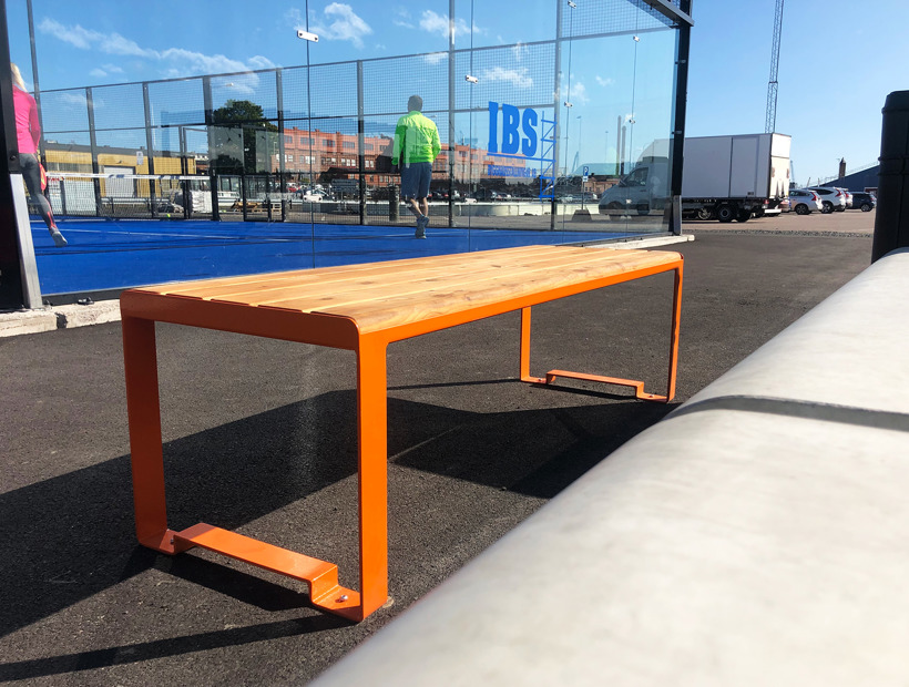 Mellan padelbanorna och havets glittrande vatten i Inre hamnen står TUCANA Bänk från Mobilis Design – en färgstark och modern inbjudan till vila och gemenskap.