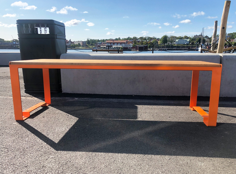 Med sin klara RAL-färg 2003 Pastel orange på stålkonstruktionen och den vackra sitsen av lärkträ lyser bänken upp den nya kajpromenaden och skapar en självklar plats att slå sig ner.