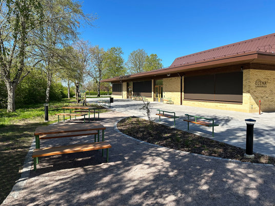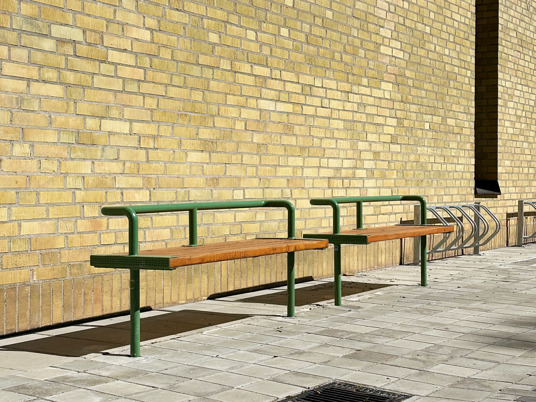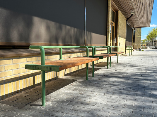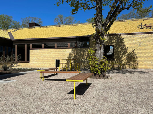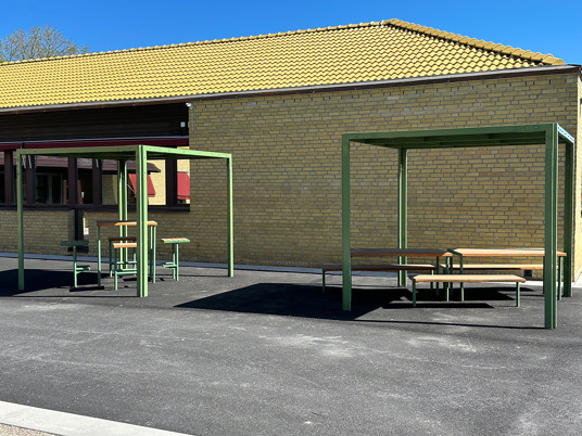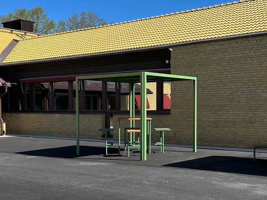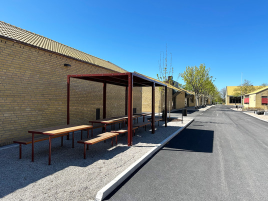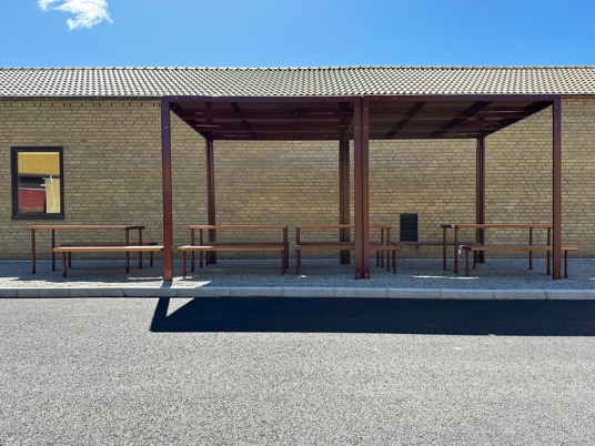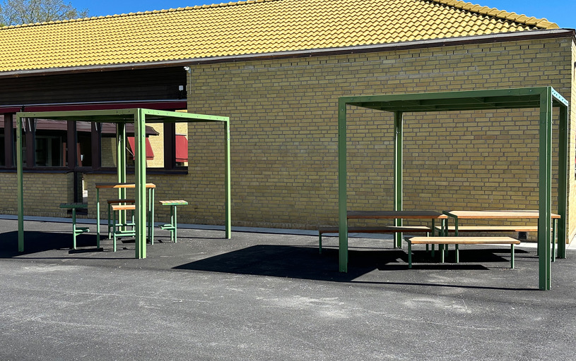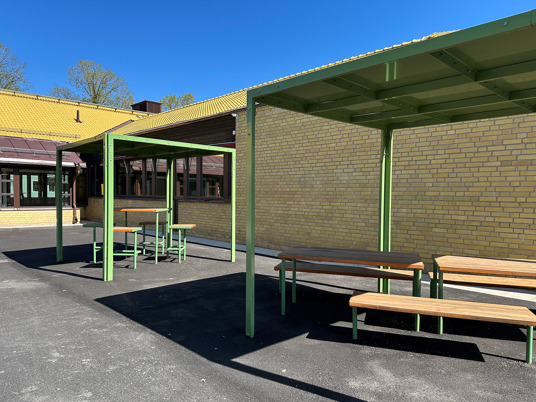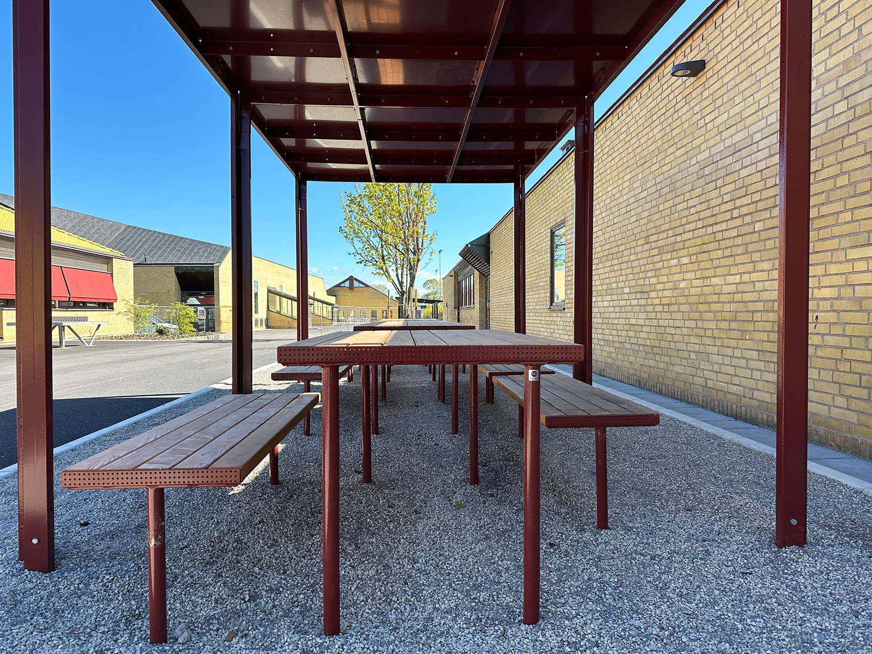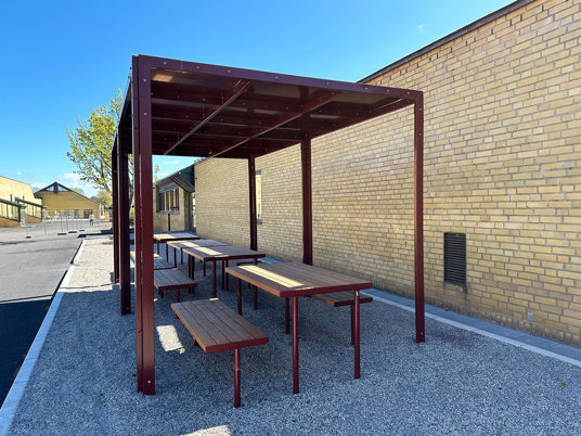Till den dubbla pergolan och möblerna där under valdes RAL 3009 Oxide red, som matchar skolans markiser perfekt.