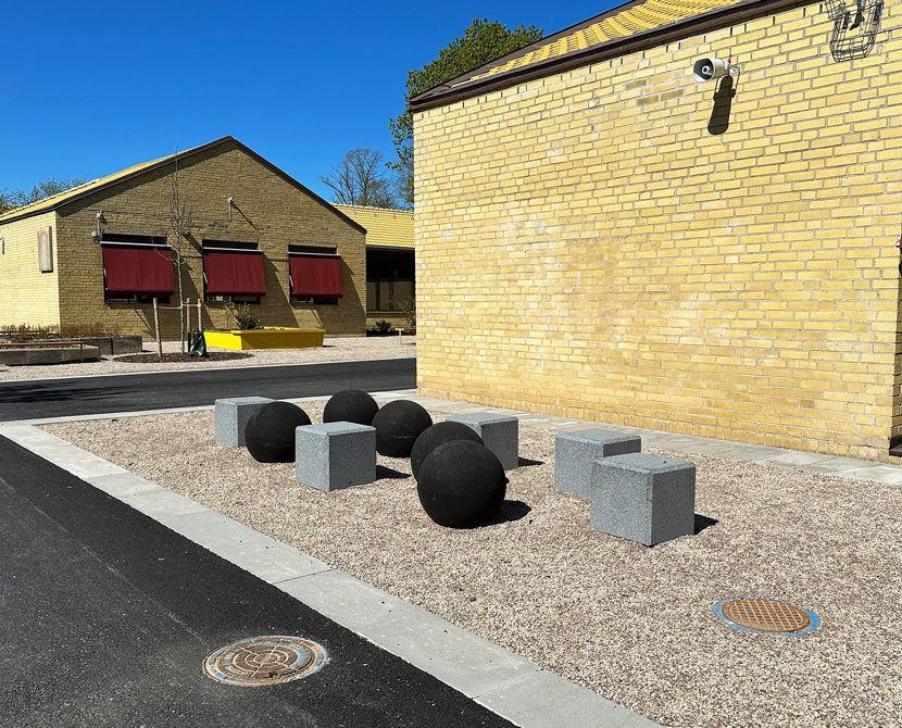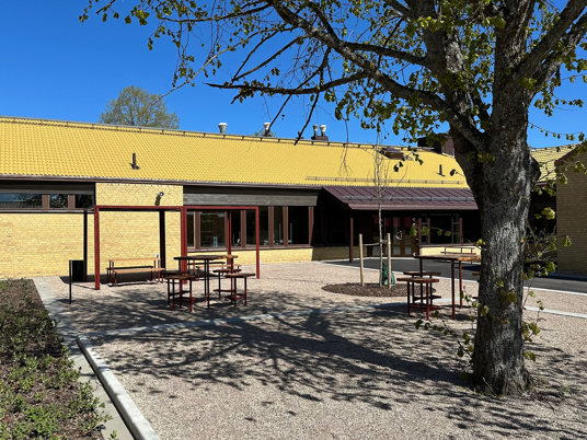 Skolan består av flera huskroppar och på skolgården har olika sittgrupper samt parkbänkar placerats ut. I skuggan under träden och i solen längs fasaden på skolbyggnaden, här finns massor av valmöjligheter.