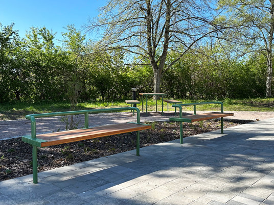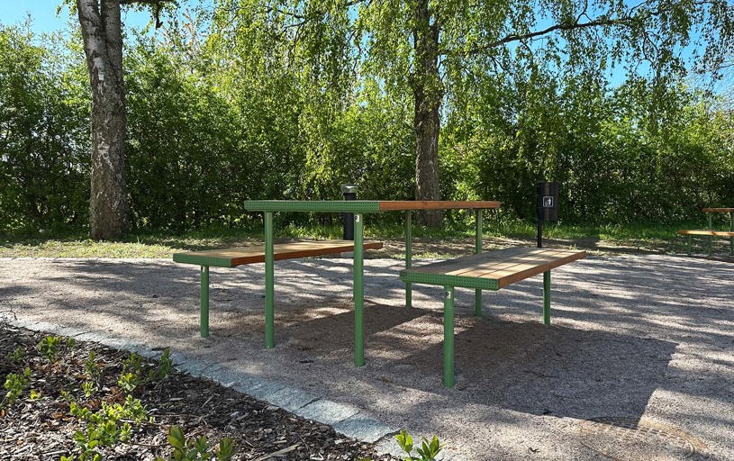Den gröna möblerna i skugga under träden pulverlackerades i RAL 6011 Reseda green, liksom singel pergolorna och möblerna där under.