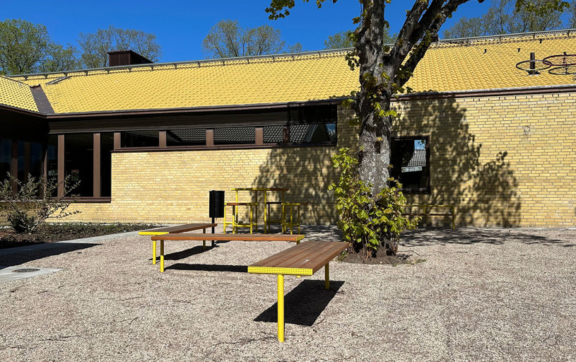 I samband med den varsamma renoveringen satsade man på helt nya utemöbler runt skolbyggnaderna. Man valde möbelfamiljen SCORPIUS från varumärket Mobilis Design. Nu kan de drygt 220 högstadieeleverna gå ut på rasterna och sitta och njuta på någon av de många nya sittplatserna. Här finns också möjlighet att ha utomhuslektion under de robusta pergolorna.