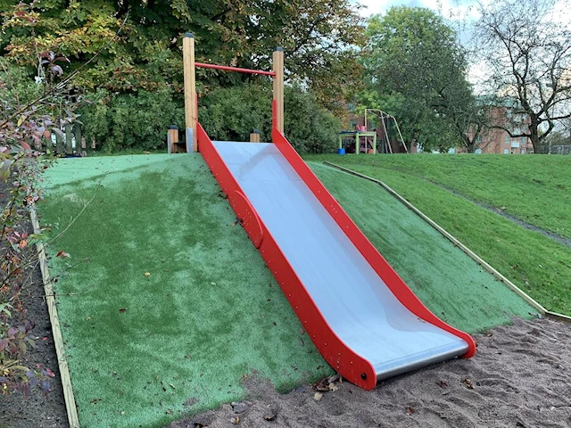 Här valdes medvetet sprakande och härliga färger på klätterställningar och sportutrustning. Med mycket grönska blir skolgården ett perfekt andningshål för både elever och personal.