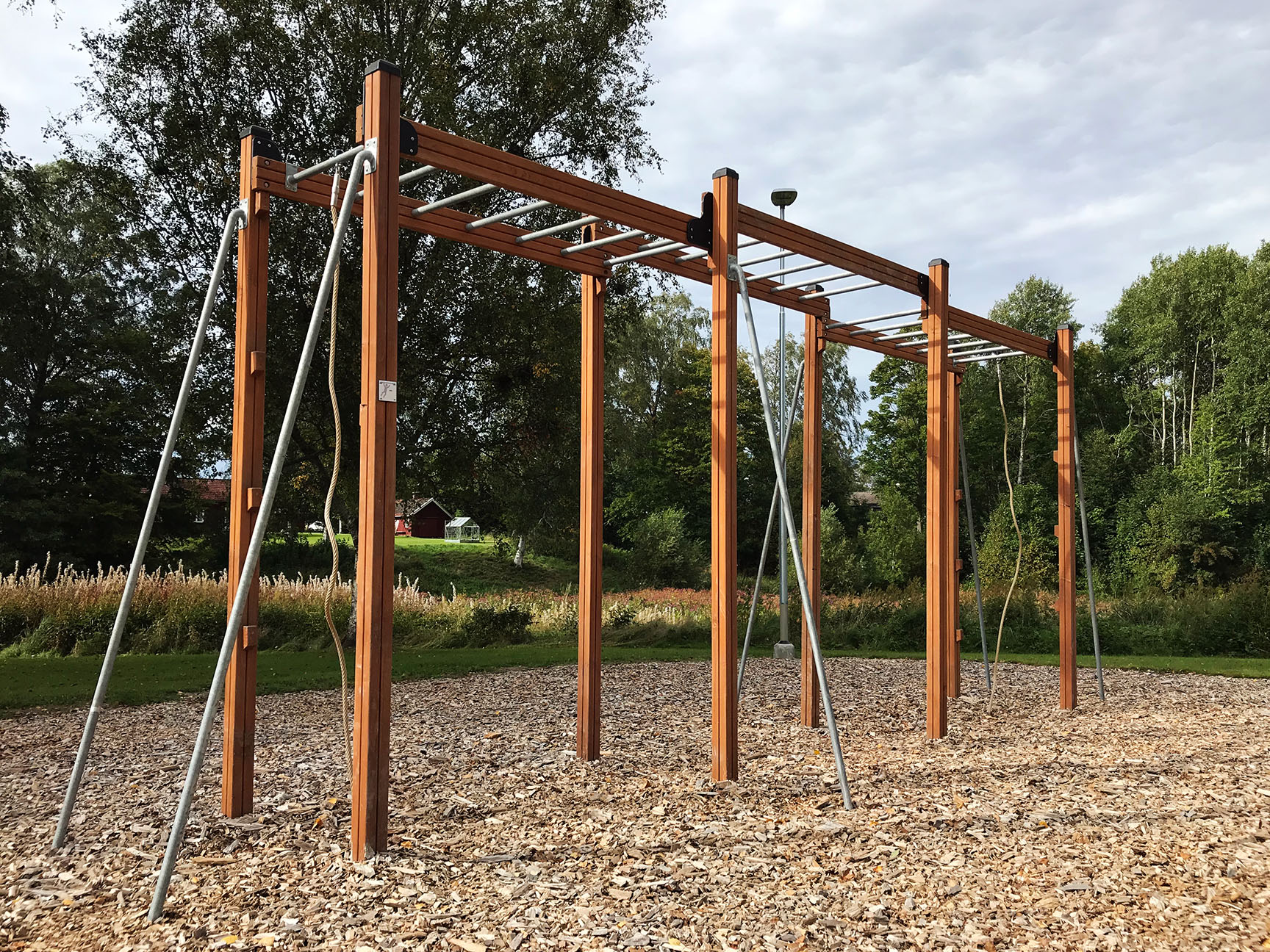 Utegymmet är av lärk och som underlag valdes träflis, en trevlig helhet som smälter bra in i de gröna omgivningarna. Lärkträ är ett tåligt träslag som kräver minimalt underhåll och står sig bra i vårt nordiska klimat.
