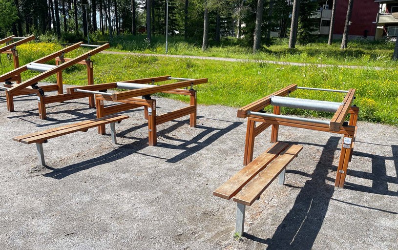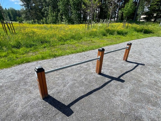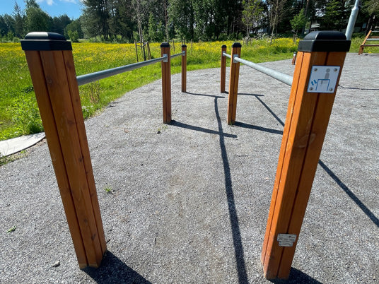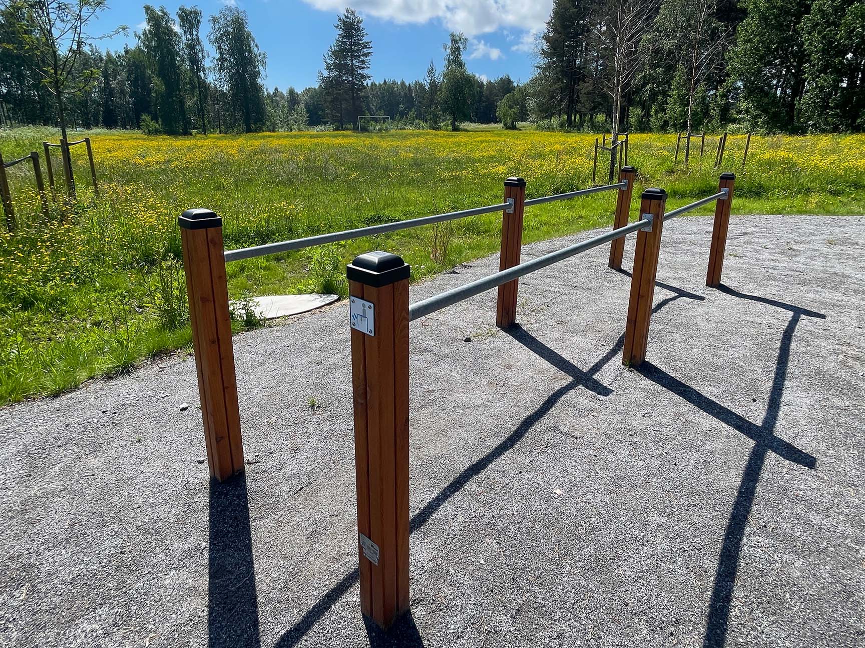 Här har vi träningsstationen Knäböj i två versioner bredvid varandra. Den högra har en extra metallvikt på 10 kg monterad på lyftstången. Det gör utegymmet mer varierat och fler kan träna på sin egen nivå.