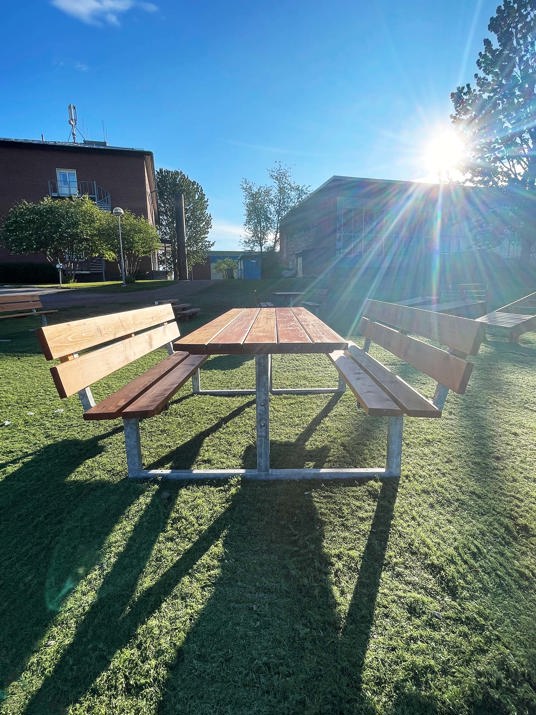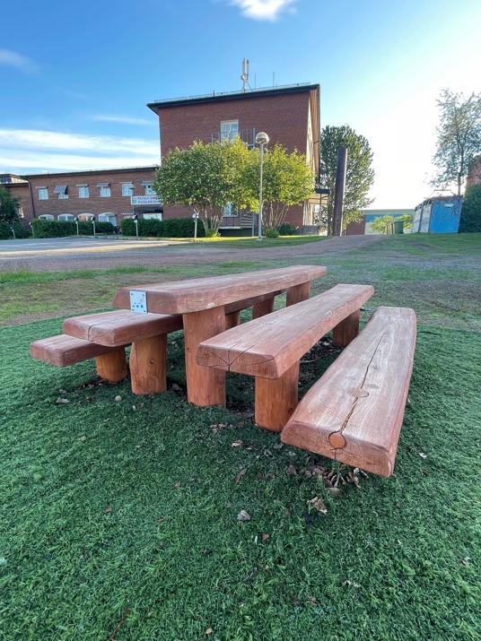 Lina Bänkbord med ryggstöd har en längre bordsskiva på en kortsidan, för att öka tillgängligheten. Bänkbordet är tillverkat av högkvalitativt lärkträ vilket ger extra hållbarhet.