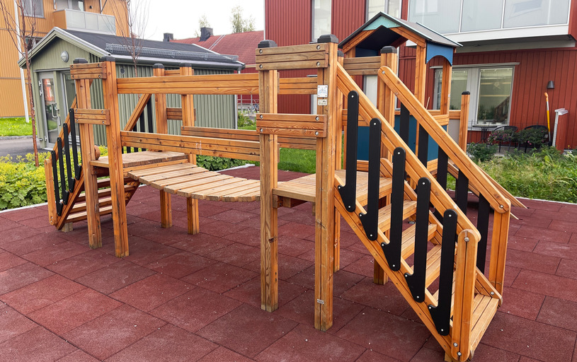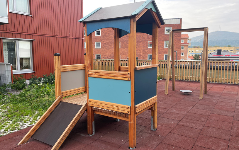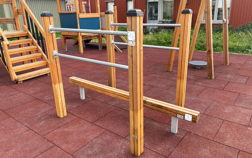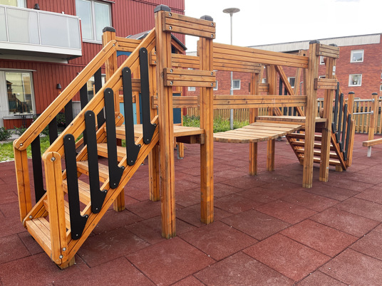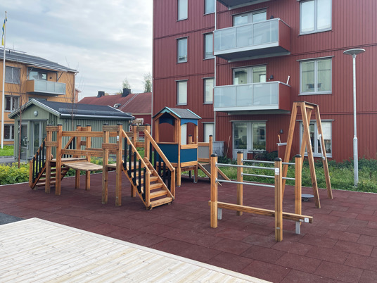 Detta blev en fantastisk yta på innergården, där barn, vuxna och mor/far-föräldrar kan leka, träna och umgås tillsammans. Trots begränsat utrymme fick man till en härlig aktivitets-yta för alla generationer i bostadsområdet. Fallskyddsplattorna gör ytan mer tillgänglig för de som har lite svårt med balansen.