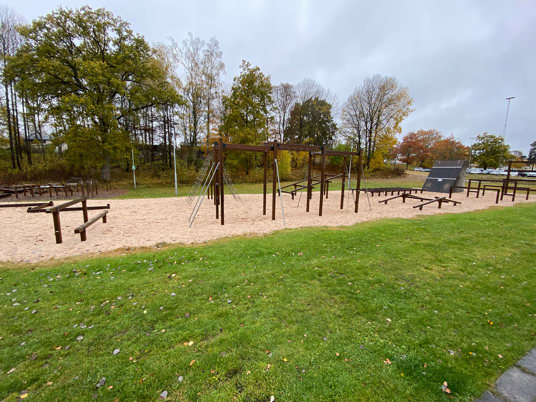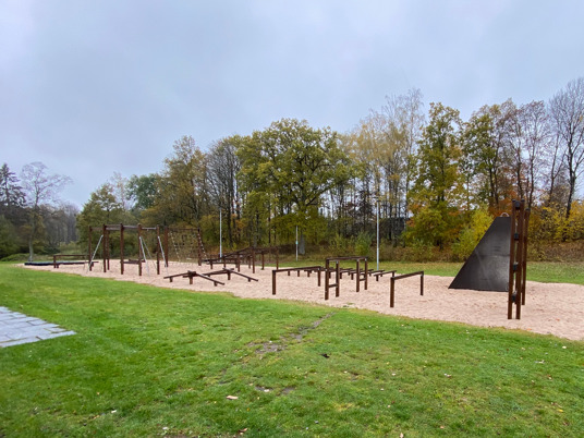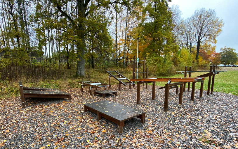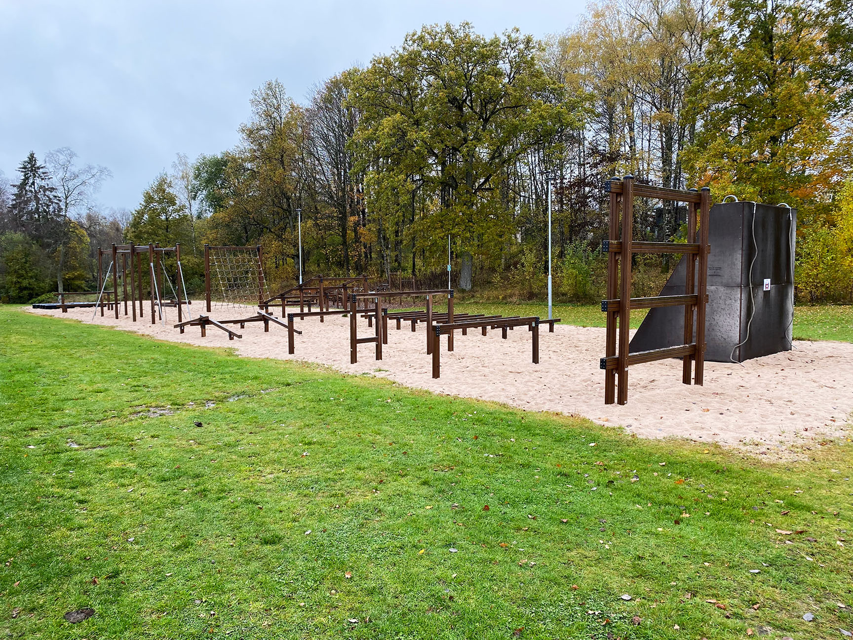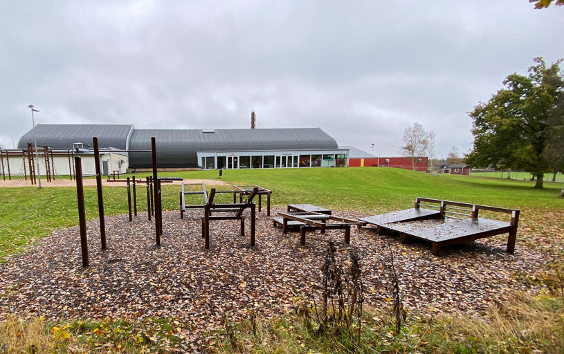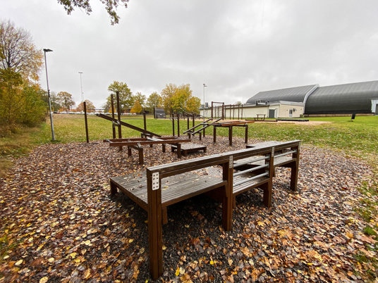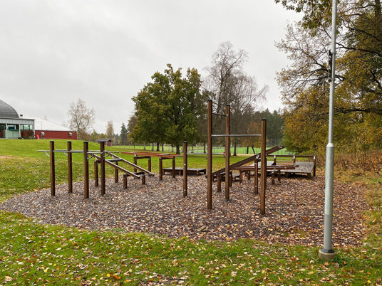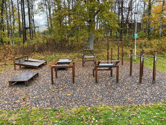 Utegymmet är utrustat med åtta olika träningsstationer. Här kan du bland annat göra knäbök, dips, sit-ups och axelpress. Perfekt att avsluta en joggingrunda i skogen med ett pass på utegymmet!